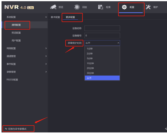 切換(huàn)到專家模式,配置-系統配置-通用配置-更多配置-屏幕保護(hù)時間。