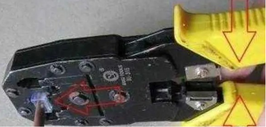 把網線排列好以後,用網線鉗剪整齊,插入水晶頭,然後壓好。依次把無根網線全部接好,並插入攝像頭上的網線口中。
