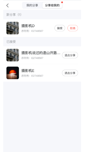 在我的-分享設置-分享給(gěi)我的列表中可以看到所有被分享的設備(bèi),如待接收設備(bèi),支持進行接收/拒絕操作。