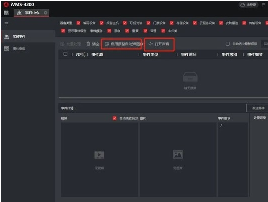 進入事件中心界面,把“啓用報(bào)警自動彈(dàn)圖”和“打開聲音”開啓~