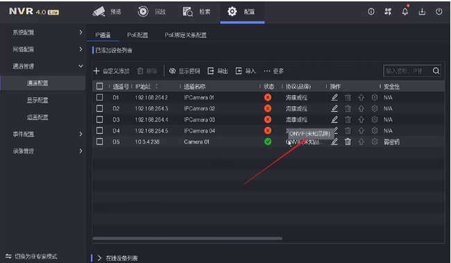 海康威視錄像機提示“未認(rèn)證的設備(bèi)(ONVIF未知品牌)”是什麽問題,怎麽解決呢?該報錯主要是協議填寫錯誤導緻,首先確認攝像機是海康攝像機還是第三方攝像機。下面帶來未認證的設備錯誤解決方法,需要的用戶可以參考一下。