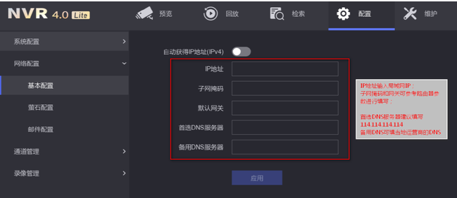 進入錄像機:配置-網絡配置—基本配置,設置設備(bèi)的IP信息,将錄像機的IP地址設置爲跟路由器同網段的IP,子網掩碼(255.255.255.0),默認網關(guān)設置爲路由器IP地址。